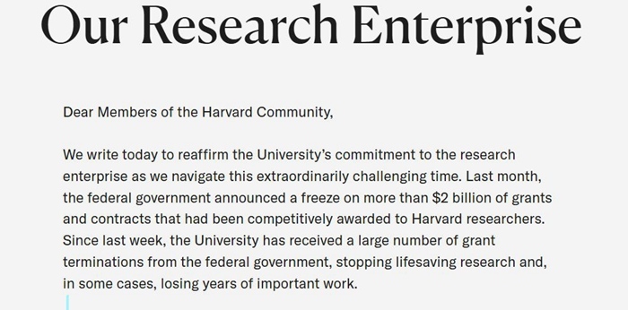 两人警告政府的行动将对美国的科研机构产生严重影响,强调哈佛大学将继续与联邦政府非法冻结联邦拨款的行为“战斗”。