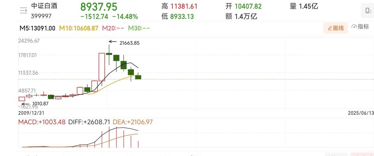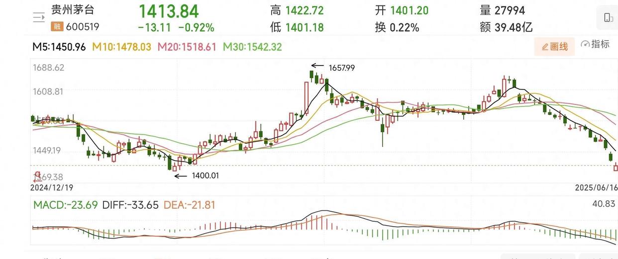 与消费端火爆相反,茅台股价正经历“滑铁卢”。 6月16日,贵州茅台股价逼近1400元,连续11个交易日主力资金净流出,累计超139亿元,市值蒸发近2000亿。 私募基金金汇荣盛、瑞丰汇邦等机构清仓减持,北向资金连续17天抛售。 散户投资者更是“谈酒变色”,中证白酒指数年内跌幅突破14%,成为A股表现最差的板块之一。