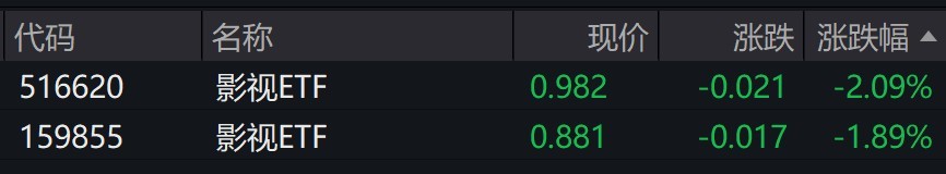 受盘面影响,跟踪中证影视主题指数的影视ETF跌约2%。